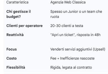 Quando paghi una fee mensile di 2.000€ o 3.000€ a un'agenzia, solo una piccola frazione di quei soldi finisce effettivamente nel lavoro operativo sul tuo progetto. Il resto serve a pagare: