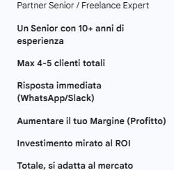 -Scegli il Freelancer Senior se: Il tuo obiettivo è la crescita, vuoi massimizzare il profitto per ogni euro speso, vuoi un rapporto umano e diretto, e vuoi smettere di dover "gestire" i tuoi fornitori.