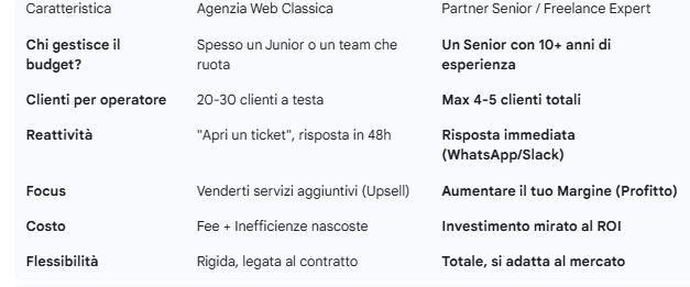 In questo articolo ti spiegherò perché, se cerchi risultati concreti e non solo "presenza online", la tua miglior risorsa non è una grande struttura, ma un Partner Digitale Senior (o Freelancer Esperto) che lavori al tuo fianco.